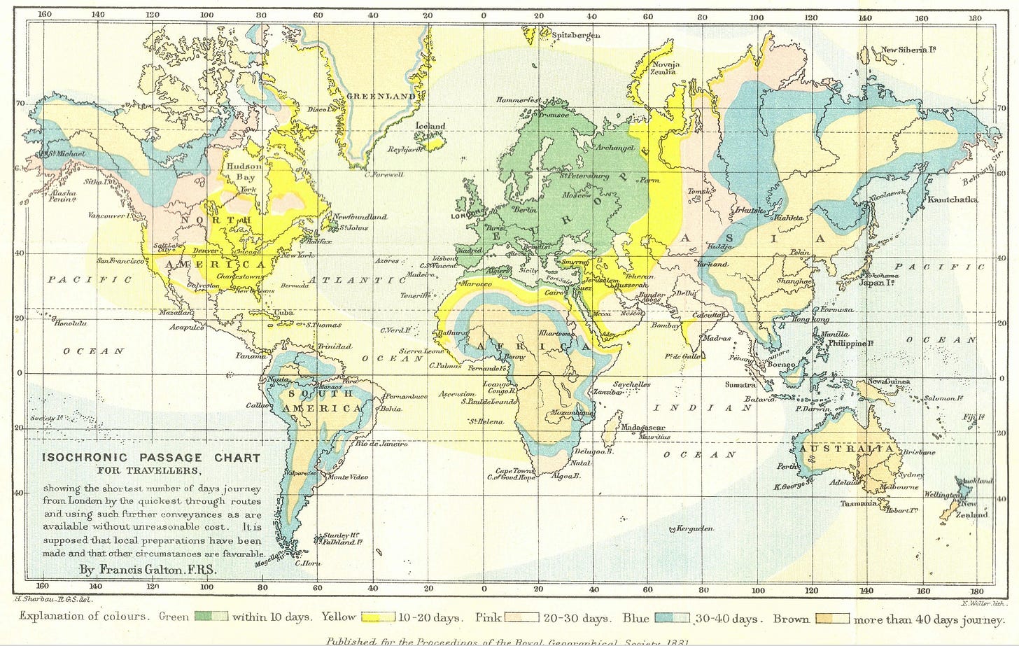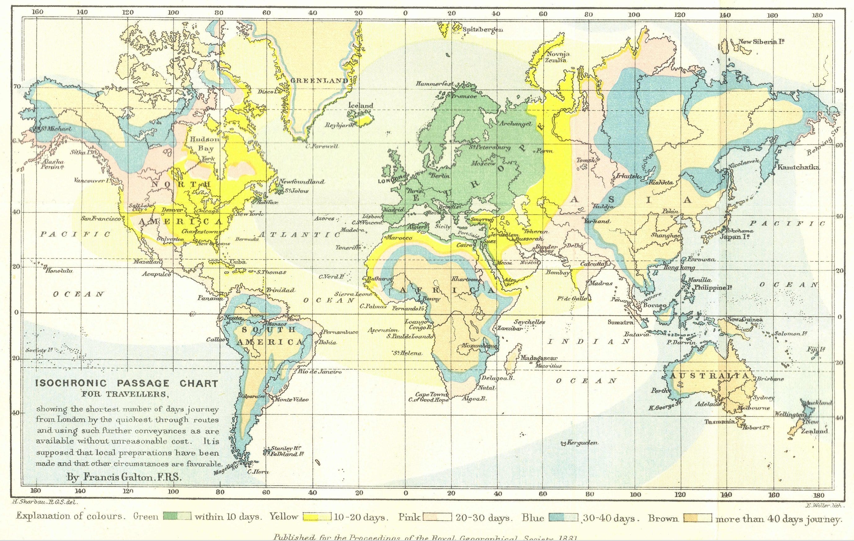 Image: Isochronic passage chart on estimated travel times from London in 1881. It’s gnarly to reflect on how interconnected we are in the present day (both physical and virtual interconnectedness). Link